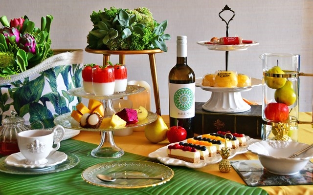 3段のケーキスタンドを使った本格的なアフタヌーンティーも、アーティフィシャルグリーンや造花を飾って涼し気な雰囲気に。