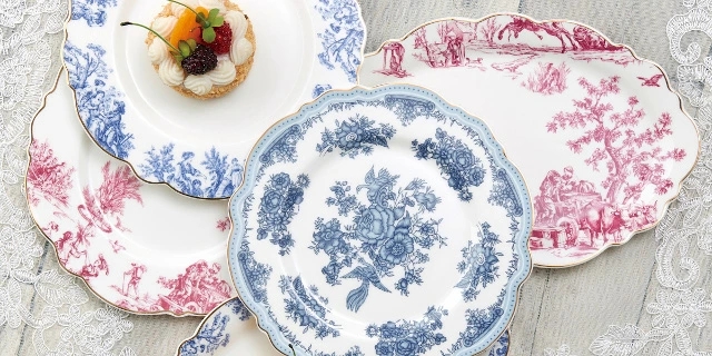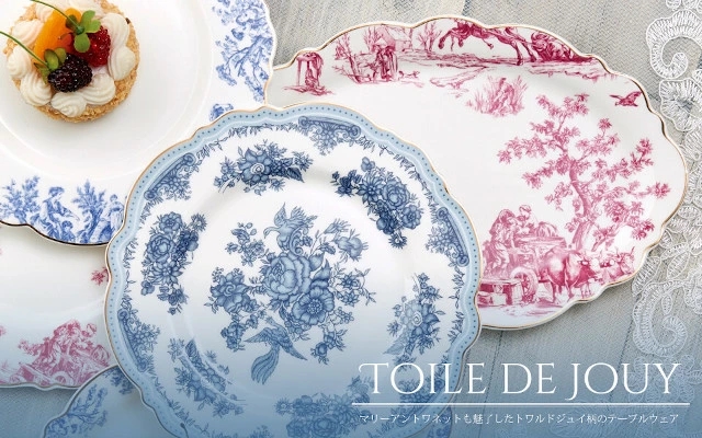 「トワルドジュイシリーズ」食器は、フランスの伝統的なToile de Jouy(トワルドジュイ)をイメージした絵柄をプリントしたお洒落で高級感のあるシリーズ。