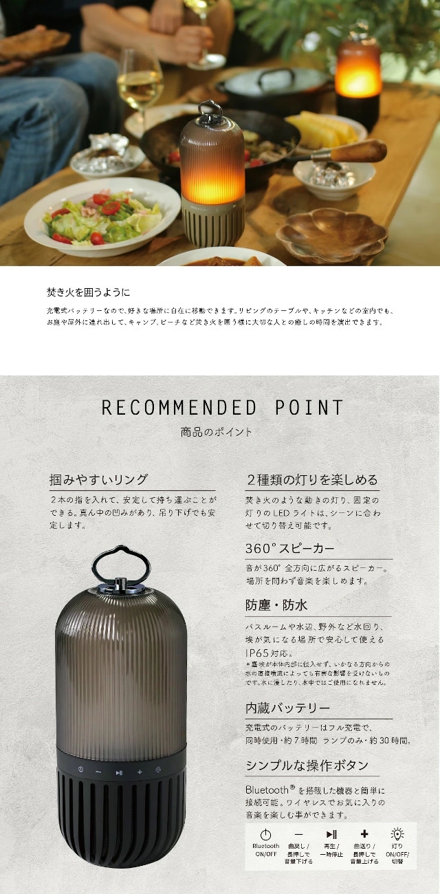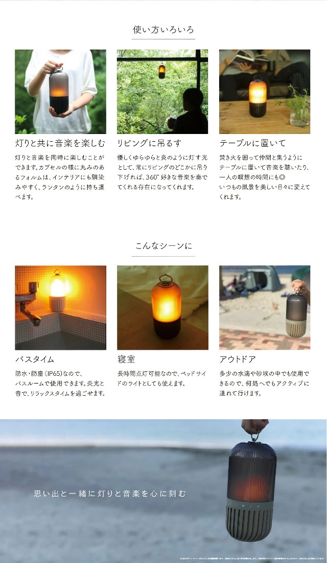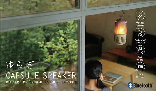”ゆらぎ CAPSULE SPEAKER”を使う事で、炎に似た灯りのゆらぎとお気に入りの音楽で、癒しのひと時を手に入れましょう。