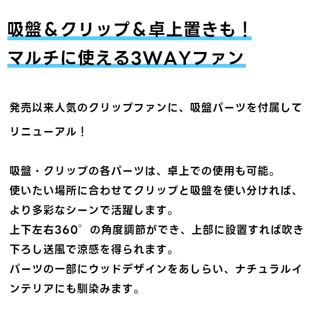 発売以来人気のクリップファンに、吸盤パーツを付属してリニューアル!