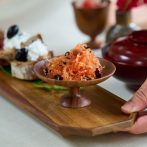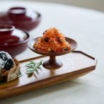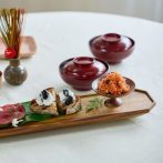 お正月のおせち料理やクリスマスの特別な一品を、ひときわ上品に引き立てる木製の脚付き豆皿です。