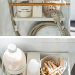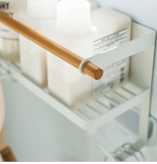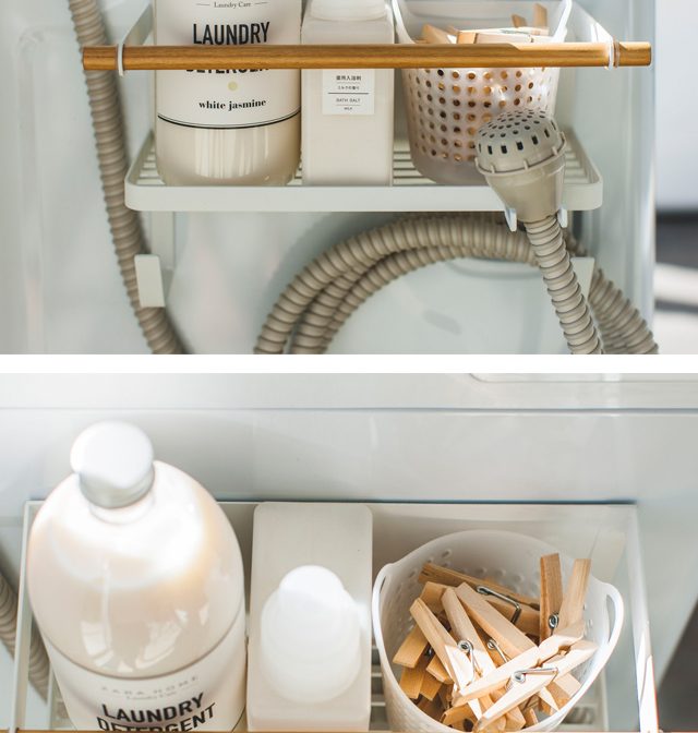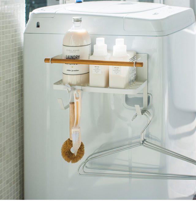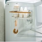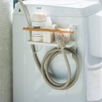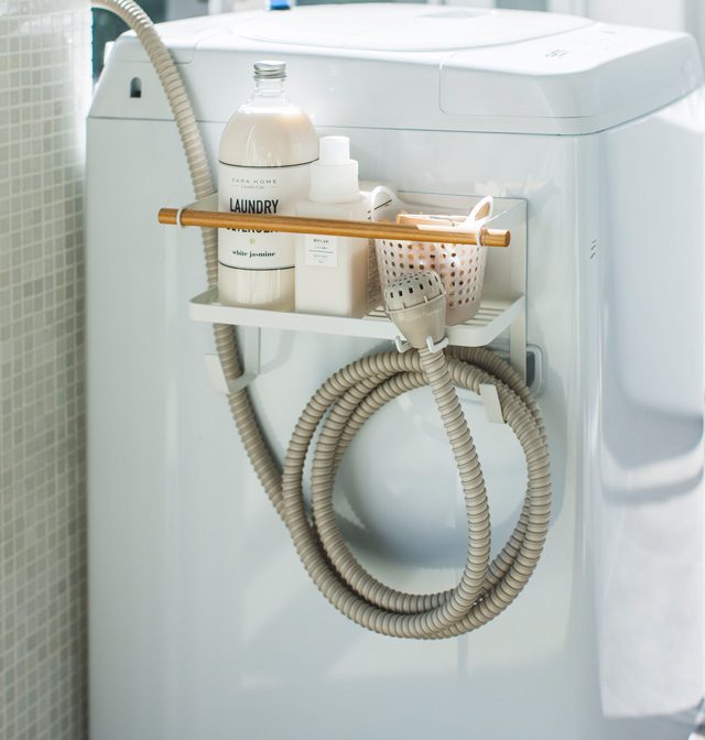 置き場所に困る給水ホースや洗濯用洗剤、小物などを洗濯機の側面に一括収納。
