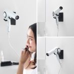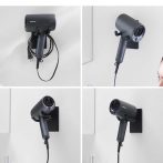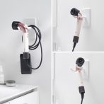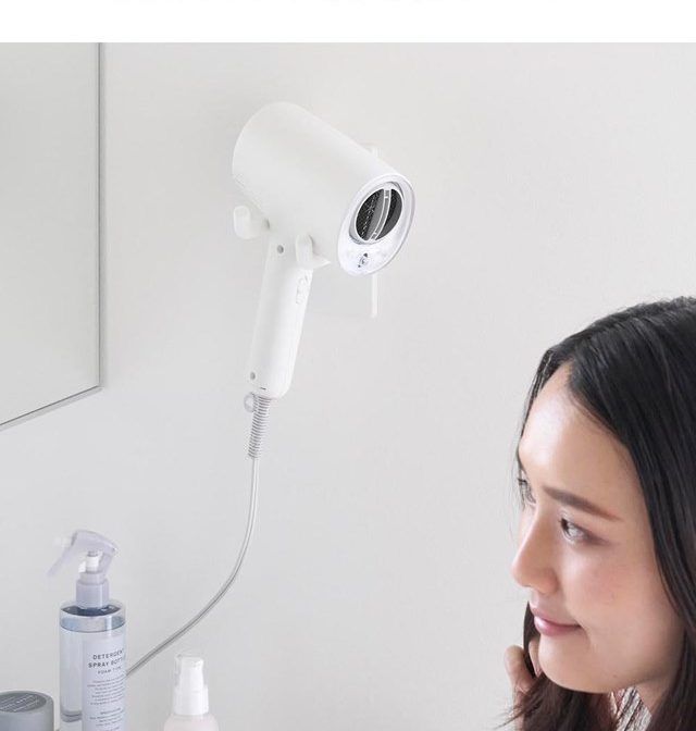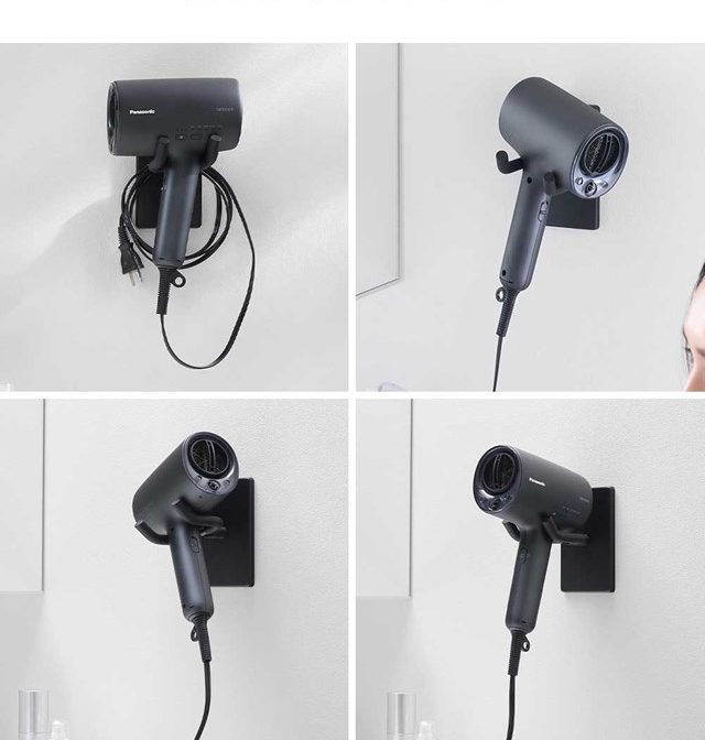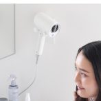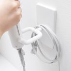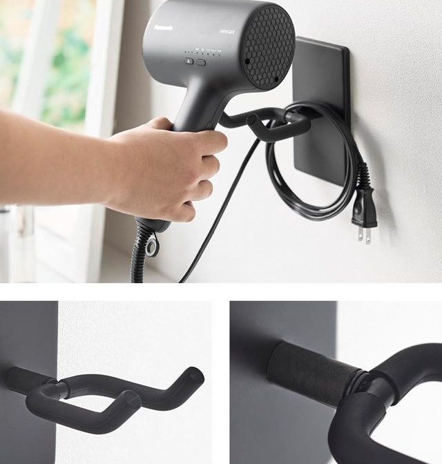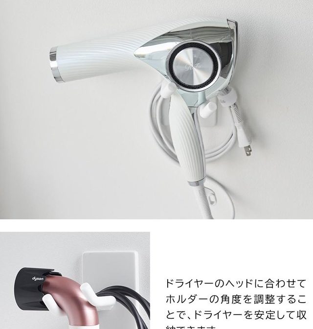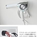 石こうボードピンで設置し、ドライヤーをセットしたまま髪を乾かせるドライヤーホルダーです。ドライヤーの形状に合わせてホルダーの角度が調節できるので、安定して収納できます。