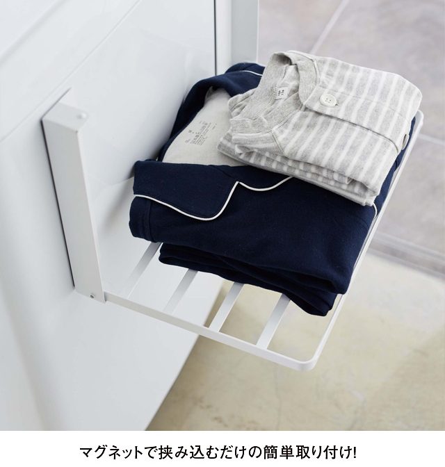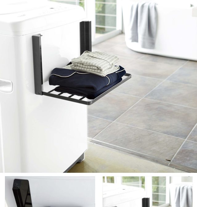 入浴後の着替えやバスタオルなどを一時置きできる便利な折り畳みラック! 洗濯機の上に置いてしまう、お風呂上りに使いたいバスタオルや着替えを一時置きできる棚。