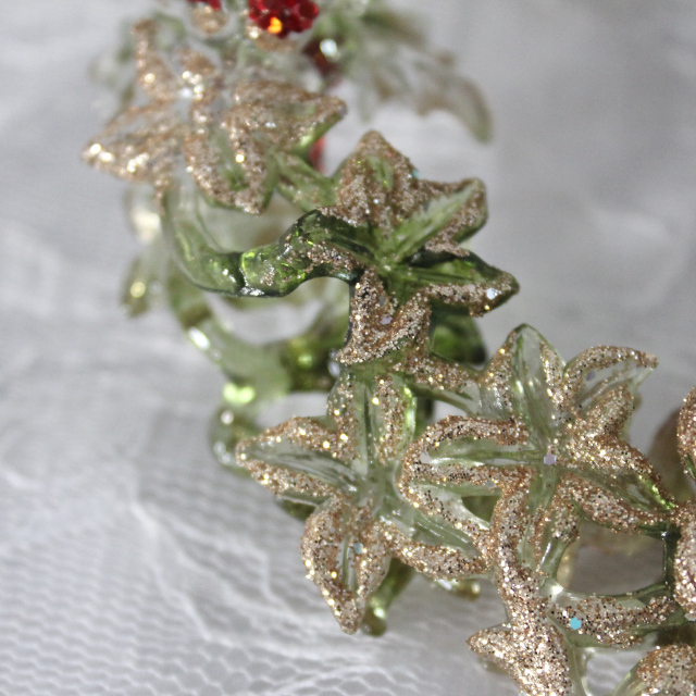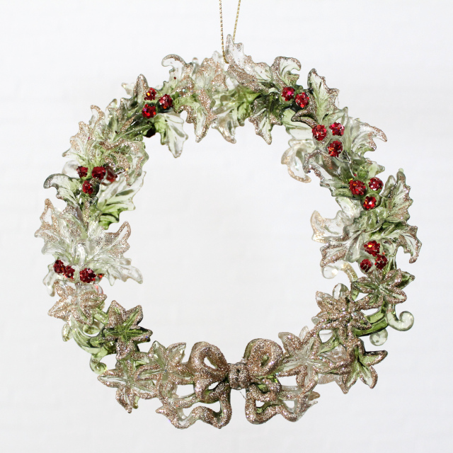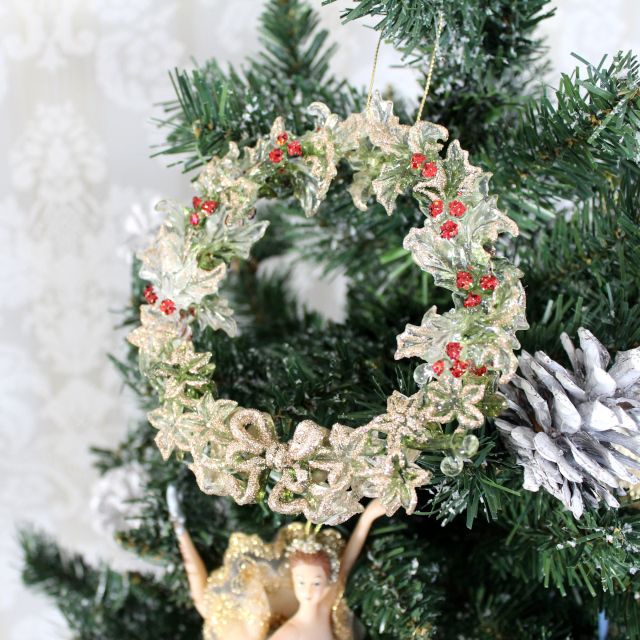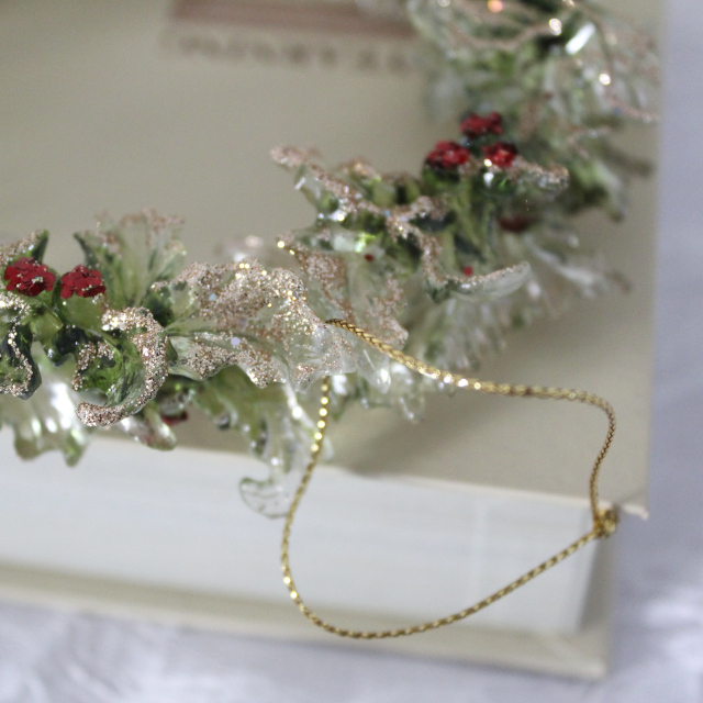 ヒイラギとポインセチアを連ねたかわいいリース型のクリスマスツリーオーナメント。