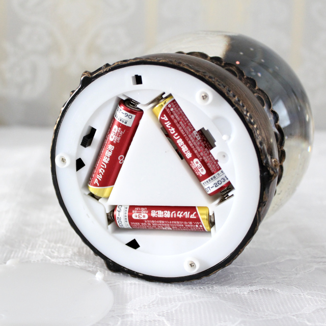 注意事項 | 単3電池x3本(別売)/USB(専用ケーブル付属) ※電池が消耗すると、最初に回転が止まります。新しい電池に取り替えてください。 中を回すためにモーターを使用しております。モーター音が鳴ることを予めご了承下さい。 ラメが沈殿して中が回りにくくなることがございます。回らない場合は上下に振ってください。 ドーム内には多少の気泡が入ります。 |