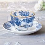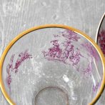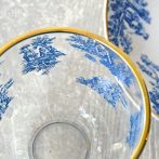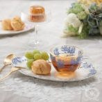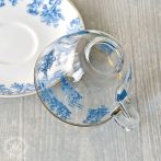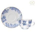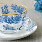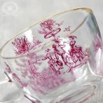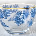 上品な深みのあるブルーでヨーロッパの人々の生活をプリントしたトワルドジュイシリーズのガラスのティーカップ。