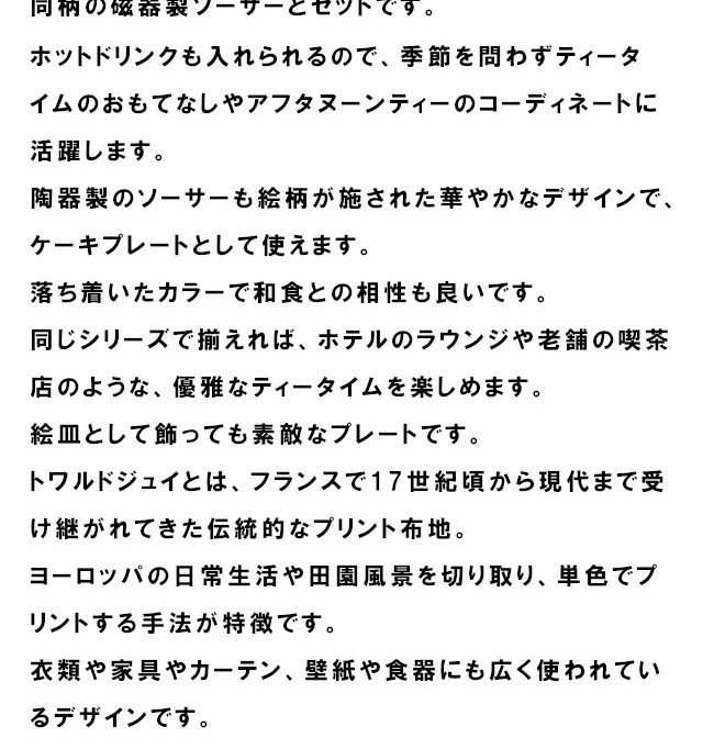 | サイズ | カップ:直径9.5φ×高さ7cm、容量225ml ソーサー:直径15φ×厚み2.5cm |