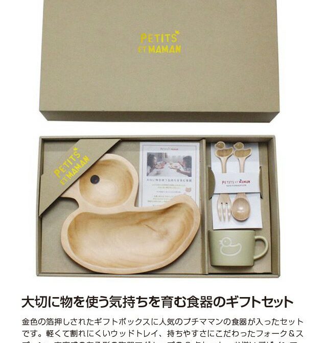 金色の箔押しされたギフトボックスに人気のプチママンの食器が入ったセットです。