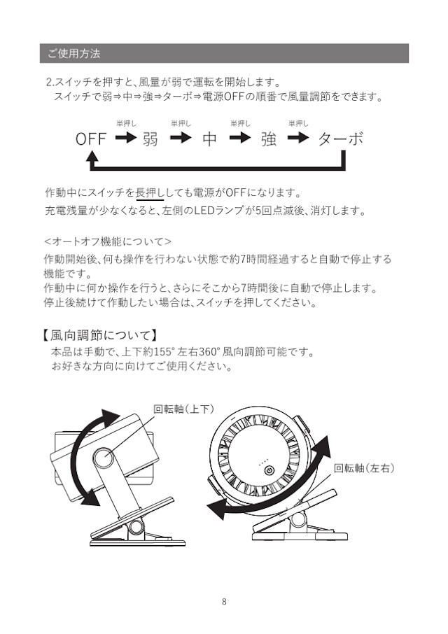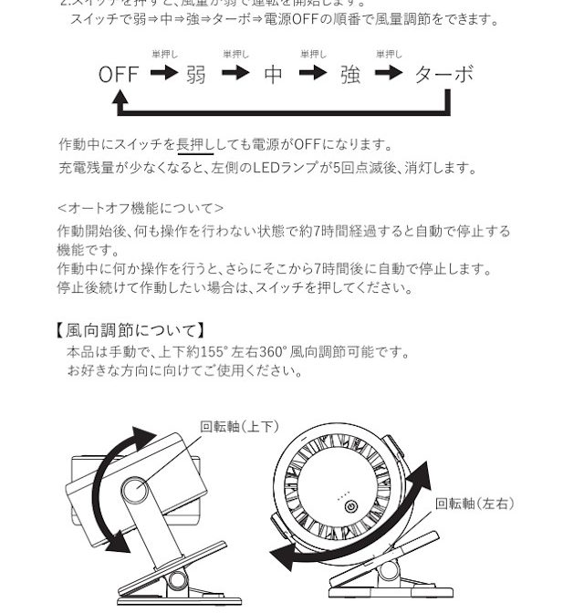 | 仕様 | 重量 450g 電源 DC5V 2A 消費電力 8.5W 充電電池 リチウムイオン電池3.7V 3000mAh 充電時間(約) 6時間 満充電時の合計使用時間(約) 1.5時間(ターボ)~11時間(弱) 風量調節 4段階(弱/中/強/ターボ) 風向調節(約) 上下合計155°、左右合計360°(手動) オートオフ(約) 7時間 電源コード(約) USBコード:750mm(Type-C) 羽根径(約) 103mm 羽根枚数 7枚 |