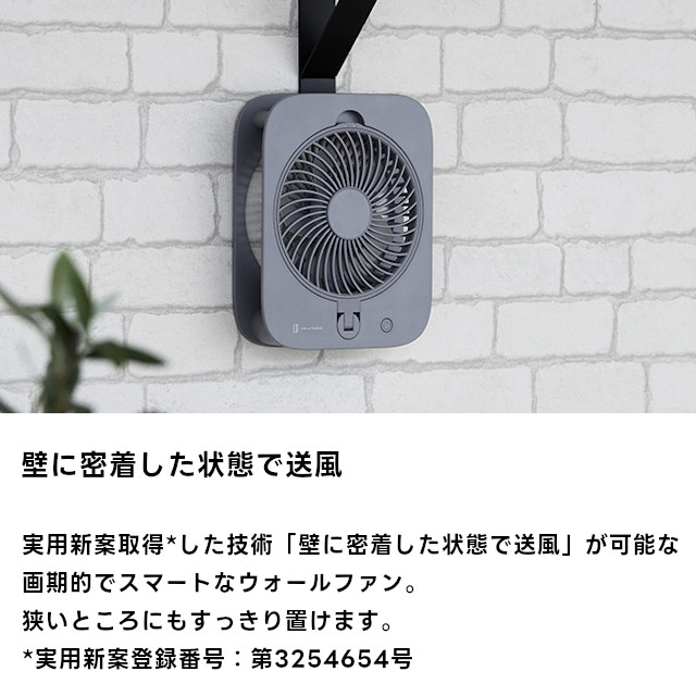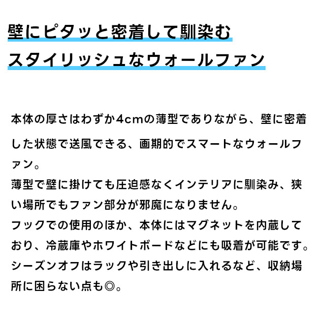 本体の厚さはわずか4cmの薄型でありながら、壁に密着した状態で送風できる、画期的でスマートなウォールファン。