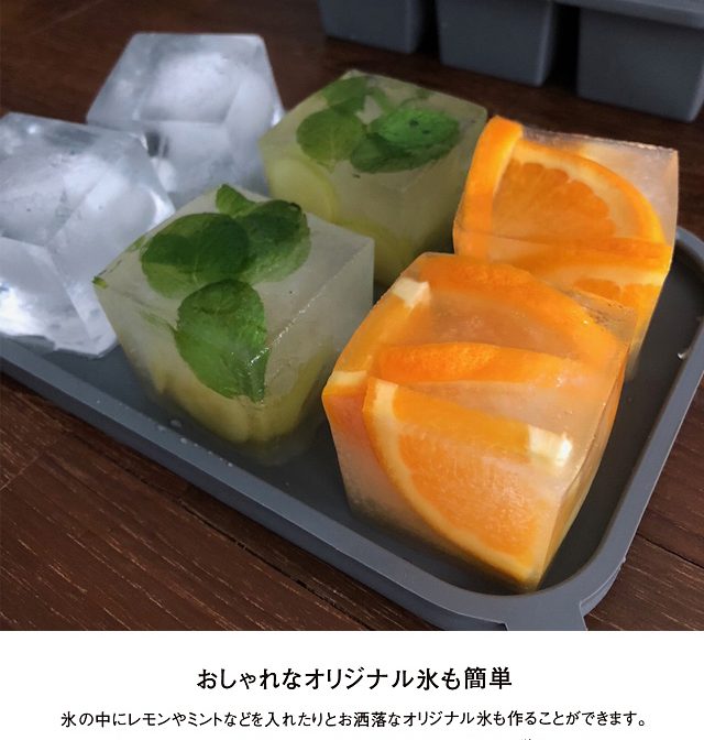 特大サイズの四角い氷が6個できるトレイです。蓋つきなので臭い移りも心配なしでスタッキングも可能です。氷の中にレモンを入れたりお洒落なオリジナル氷も作ることができます。シリコン製で取り出しも簡単!