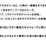 | 対応サイズ | 高さ約7cmまでの一般的なティッシュボックス・ペーパータオルなど 収納枚数の目安:箱タイプ・ソフトパックタイプ400枚(200組)まで ペーパータオル200組まで ※材質により異なります。 |