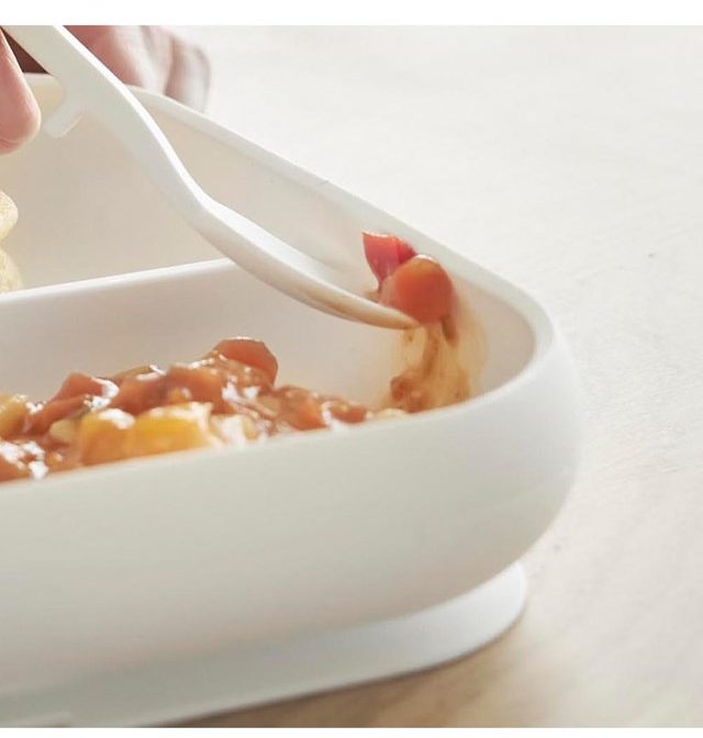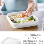 底面が吸盤になっていて、テーブルに吸着し、ひっくり返らないシリコーン製トレー。食器が滑りにくいのでお子様ひとりでも食べやすい。離乳食やごはんがスプーンですくいやすい構造。