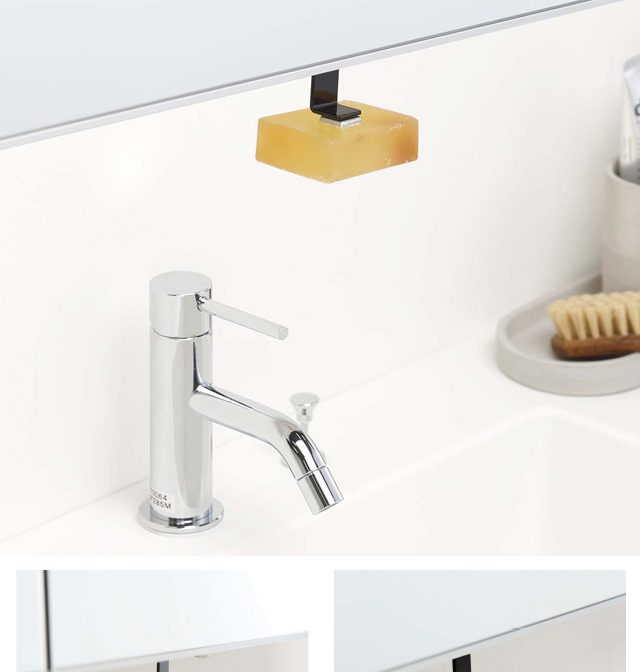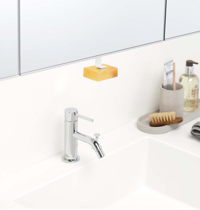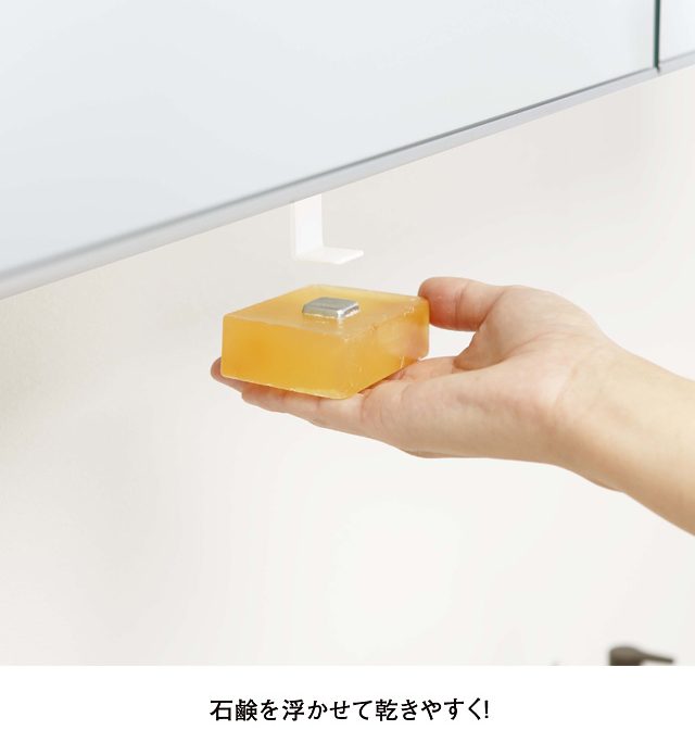 洗面所の吊り戸棚に浮かして取り付けられるマグネット式石鹸ホルダー!