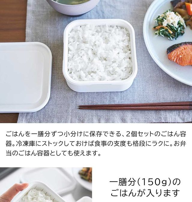 一膳分のごはんを冷凍保存できる、ザル付き冷凍ごはん容器2個セット。冷凍庫に立てて収納可能。ザルがあるので蒸気が循環し、炊き立てのような仕上がりに。蒸し調理にも◎