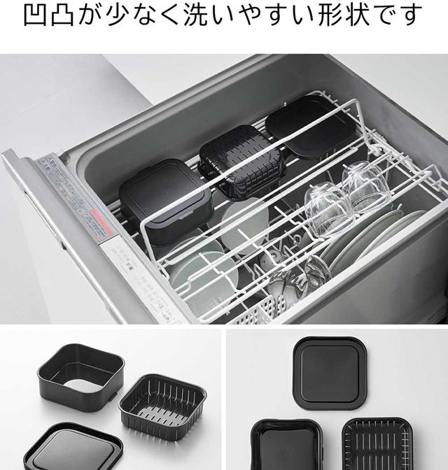 蓋をしたまま電子レンジで加熱でき、容器・ザル・蓋は凹凸が少なく洗いやすい設計で食器洗い乾燥機にも対応しています。