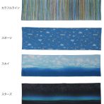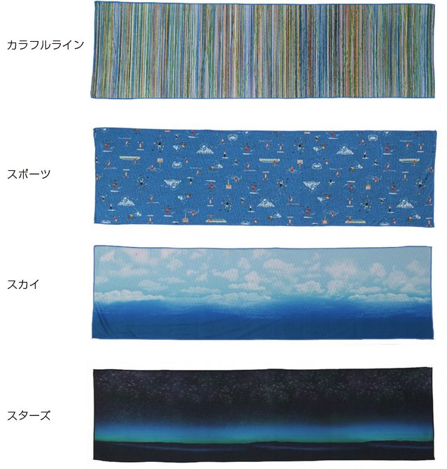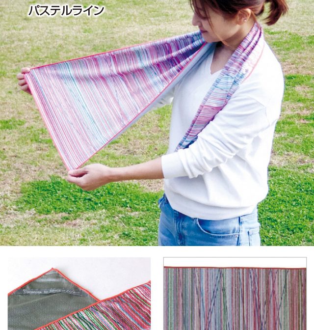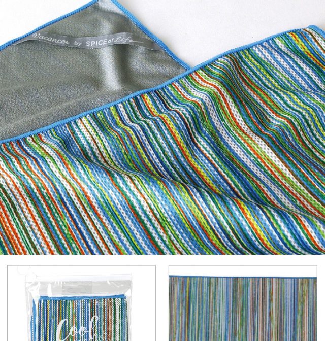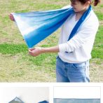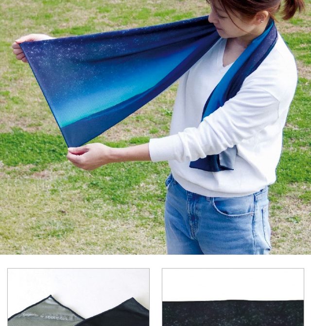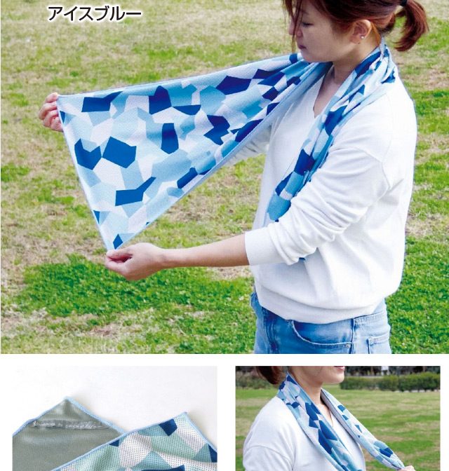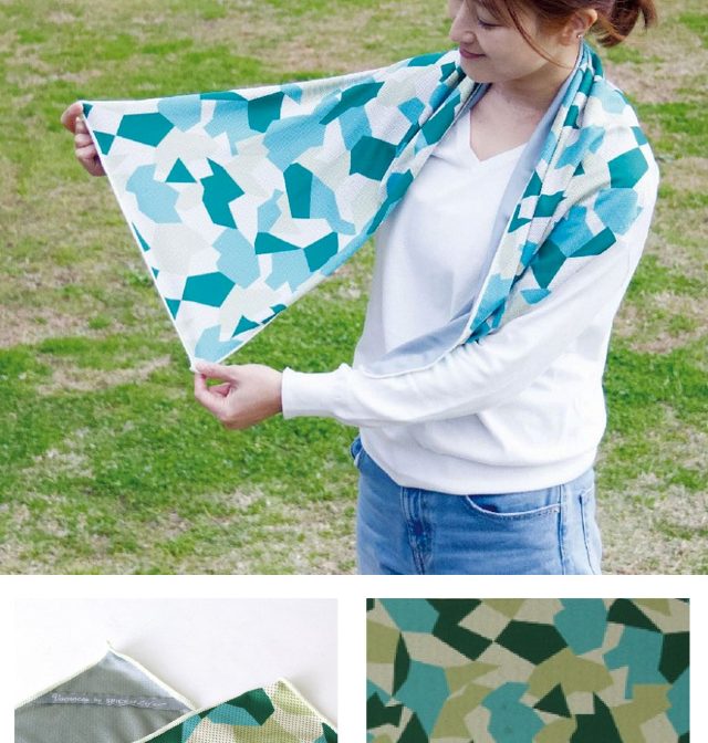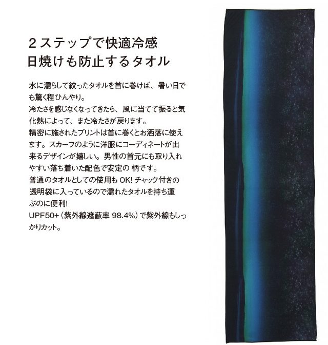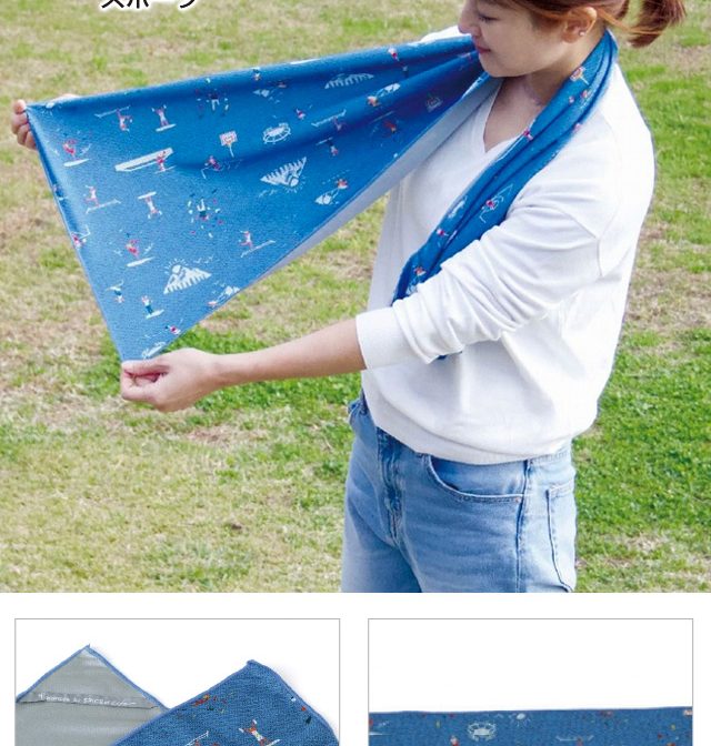 水に濡らして絞ったタオルを首に巻けば、暑い日でも驚く程ひんやり。冷たさを感じなくなってきたら、風に当てて振ると気化熱によって、また冷たさが戻ります。精密に施されたプリントは首に巻くとお洒落に使えます。スカーフのように洋服にコーディネートが出来るデザインが嬉しい。