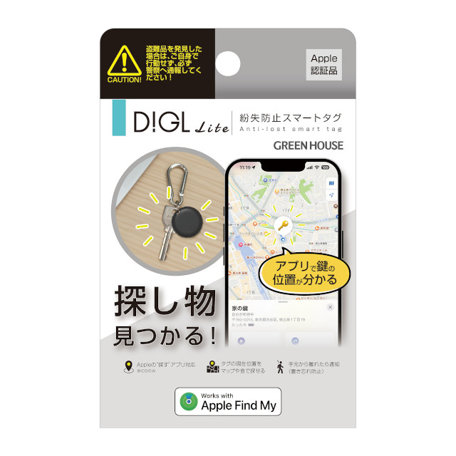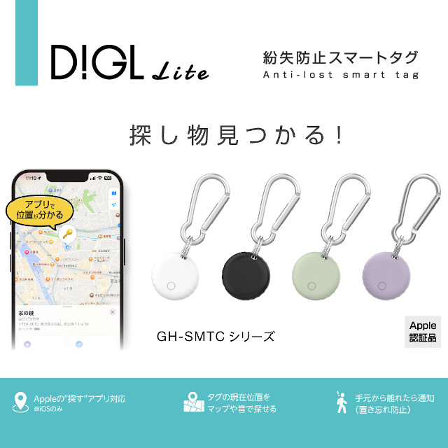 紛失防止スマートタグ DIGLlite GH-SMTC【グリーンハウス Apple Find My対応 忘れ物チェッカー iphone ipad 探す 紛失 盗難 防止 置き忘れ 子供 忘れ物 追跡 迷子 スマートフォン 落とし物 位置情報 タグ トラッカー ペット 母の日 父の日 クリスマス xmas】
