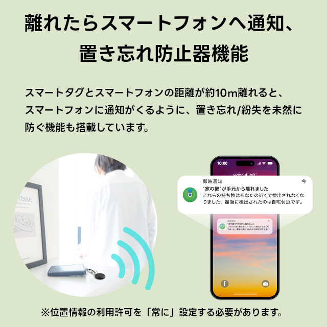 離れたらスマートフォンへ通知、置き忘れ防止器機能