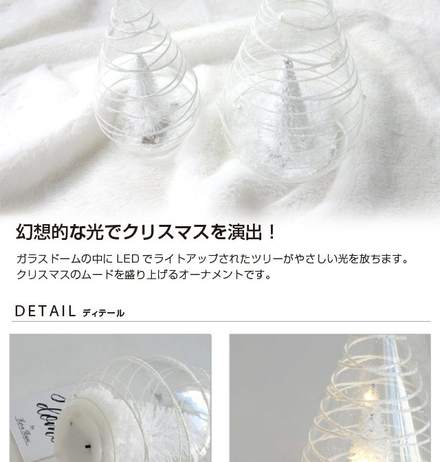 ガラスドームの中にLEDでライトアップされたツリーがやさしい光を放ちます。