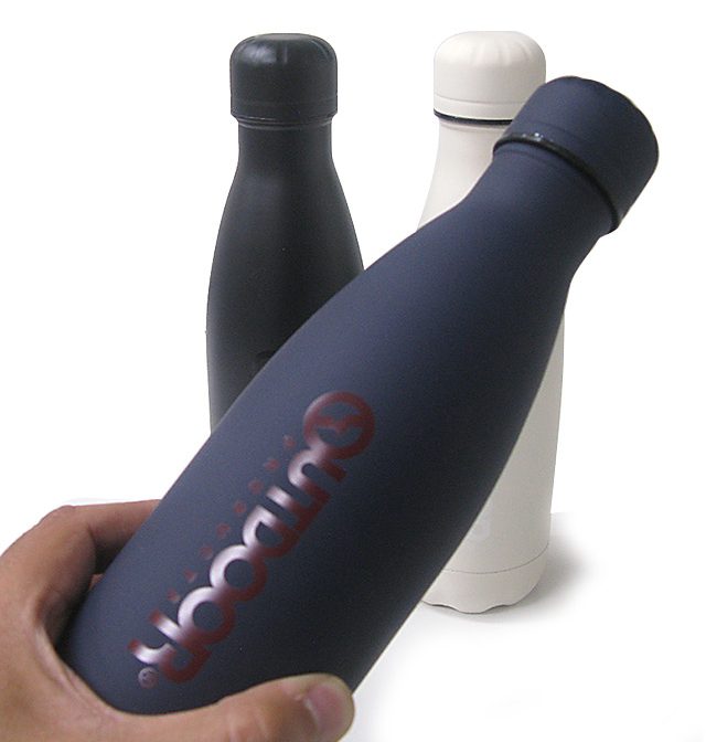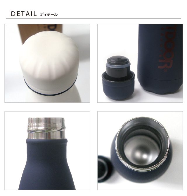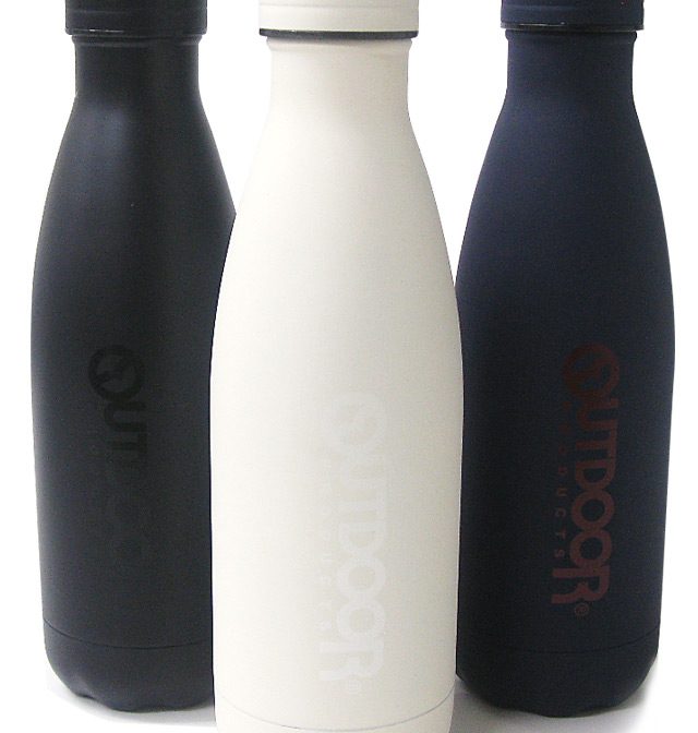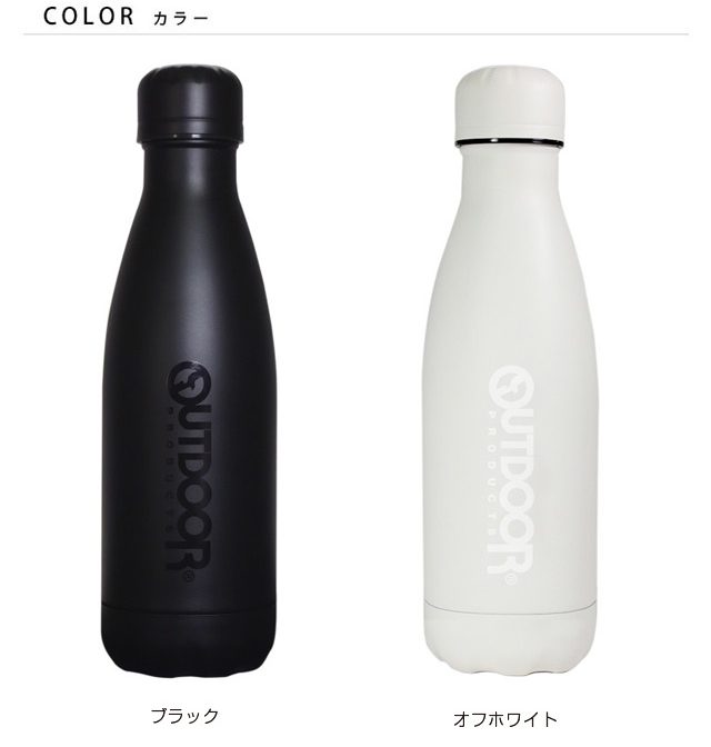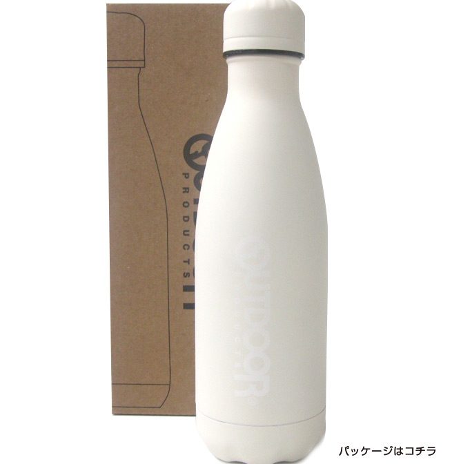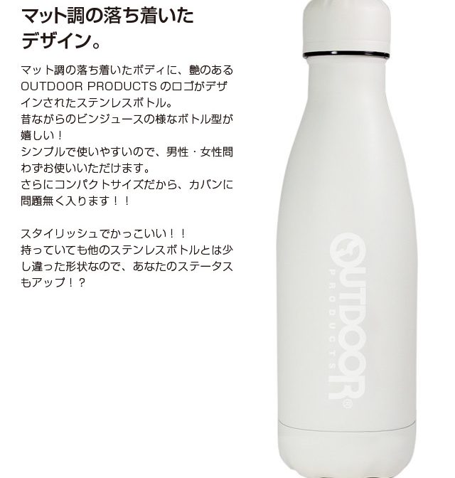 マット調のボディに、艶のあるOUTDOOR PRODUCTSのロゴがデザインされたステンレスボトル。