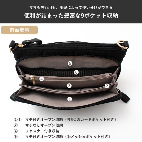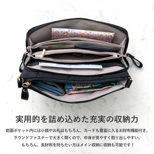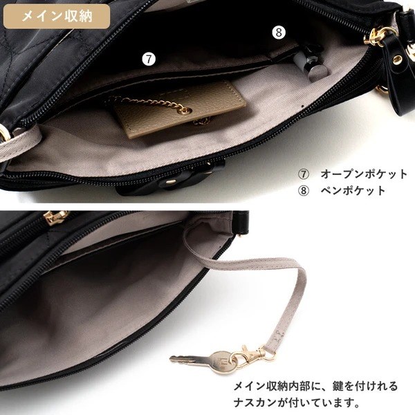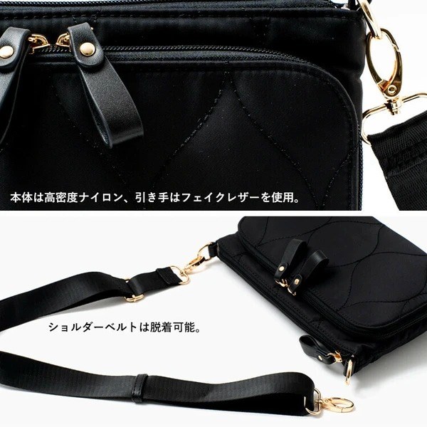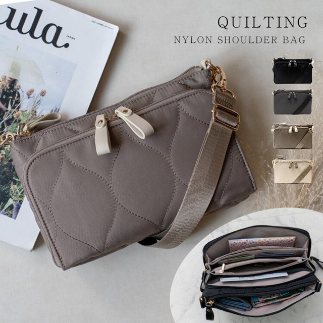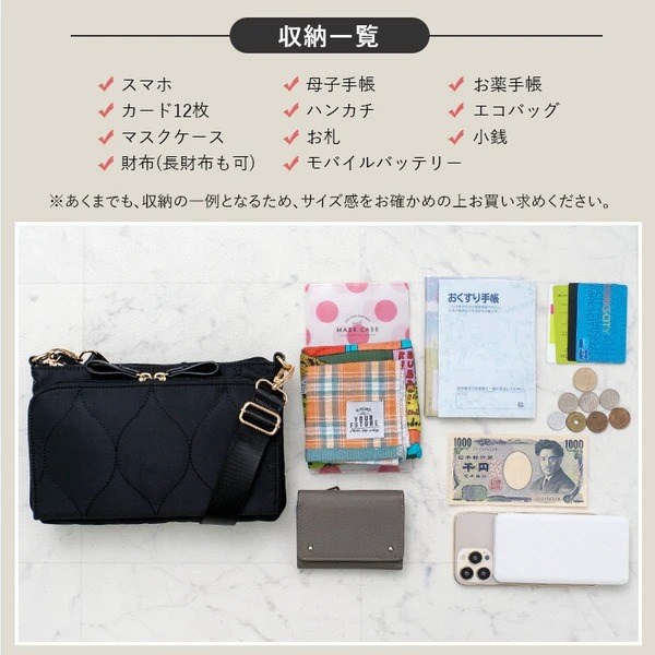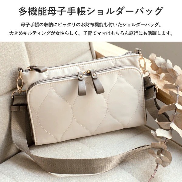 母子手帳や通帳の収納にピッタリな多収納キルティングショルダーバッグ。