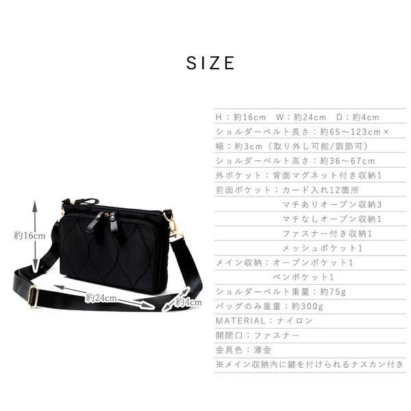 | サイズ | 高さ:約16cm / 幅:約24cm / マチ:約4cm ショルダーベルト長さ:約65~123cm×幅:約3cm(取り外し可能/調節可) ショルダーベルト高さ:約36~67cm ショルダーベルト重量:約75g |