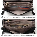 | 仕様 | 外ポケット:背面マグネット付き収納1 前面ポケット:カード入れ12箇所、マチありオープン収納3、マチなしオープン収納1、ファスナー付き収納1、メッシュポケット1 メイン収納:オープンポケット1、ペンポケット1 バッグのメイン開閉口はファスナーになっております。 |