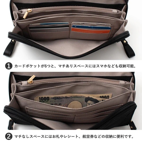前面ポケット内には小銭やお札、カードも豊富に入るお財布機能付き。