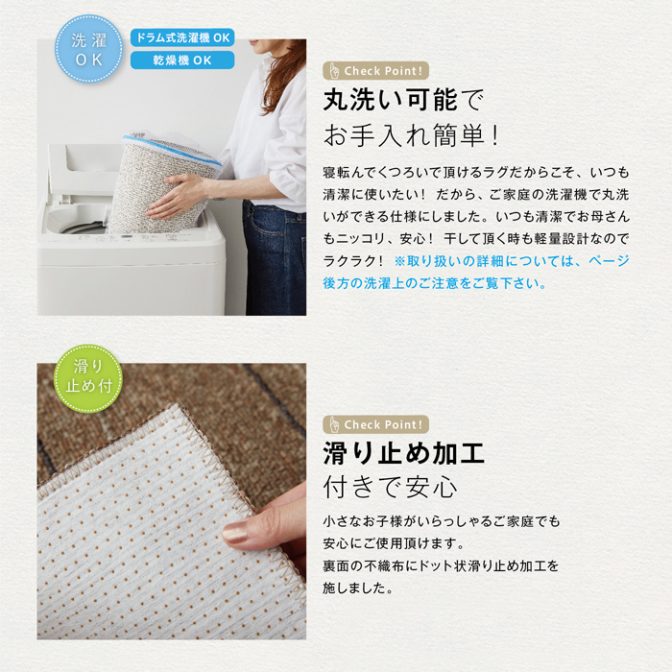 丸洗い可能なダイニングラグ。小さくたためて丸洗い洗濯可能。