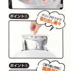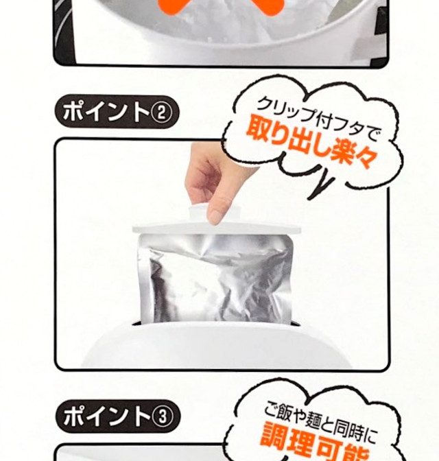 1.クリップ付フタのつまみをつまんで、レトルトバウチをはさみます。