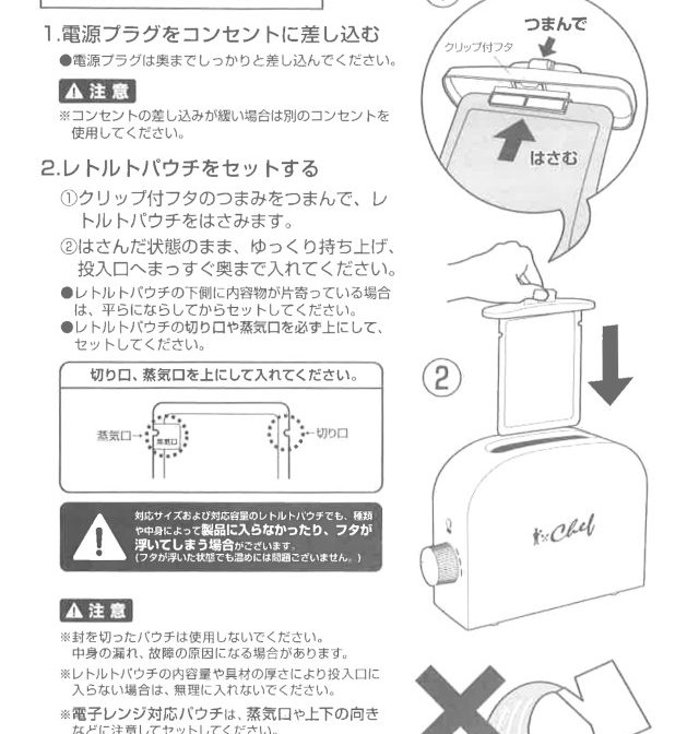 レトルトパウチの切り口や蒸気口を必す上にして、セットしてください。