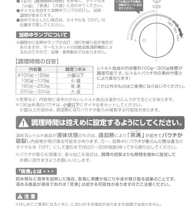 【調理時間の目安】を参考にダイヤルを「小盛」「普通」「大盛」に合わせて下さい。
