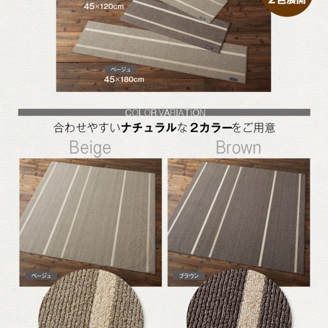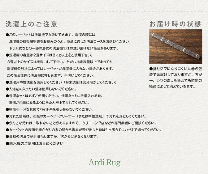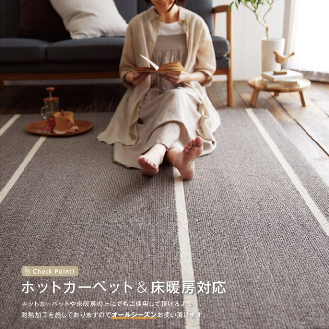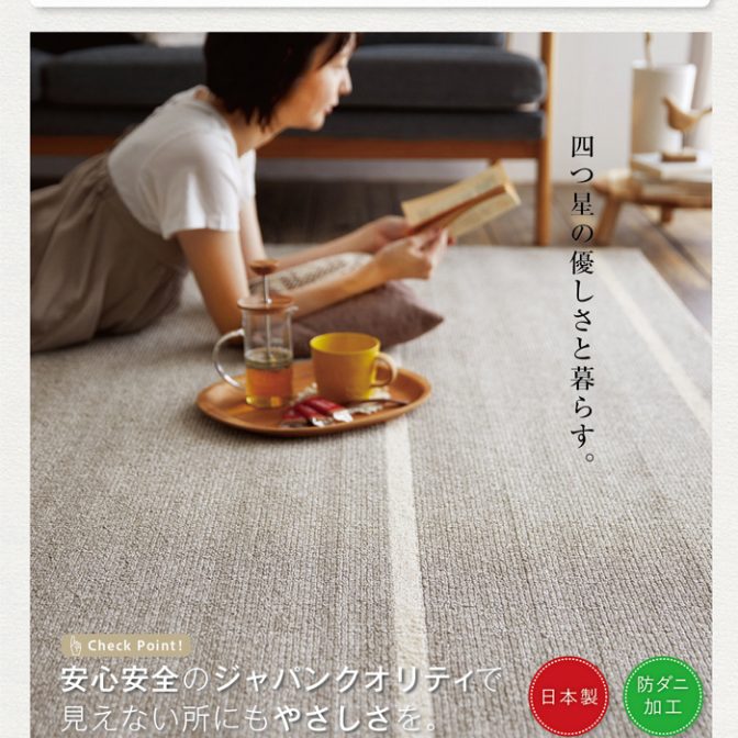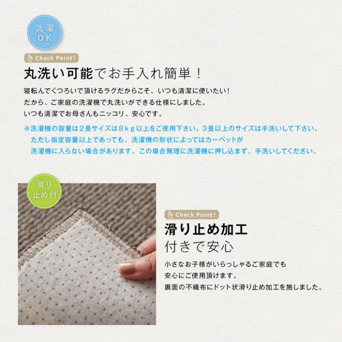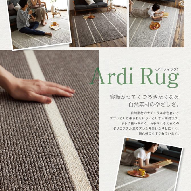 自然素材のナチュラルな風合い。洗えるすべり止め付日本製ラグ。
