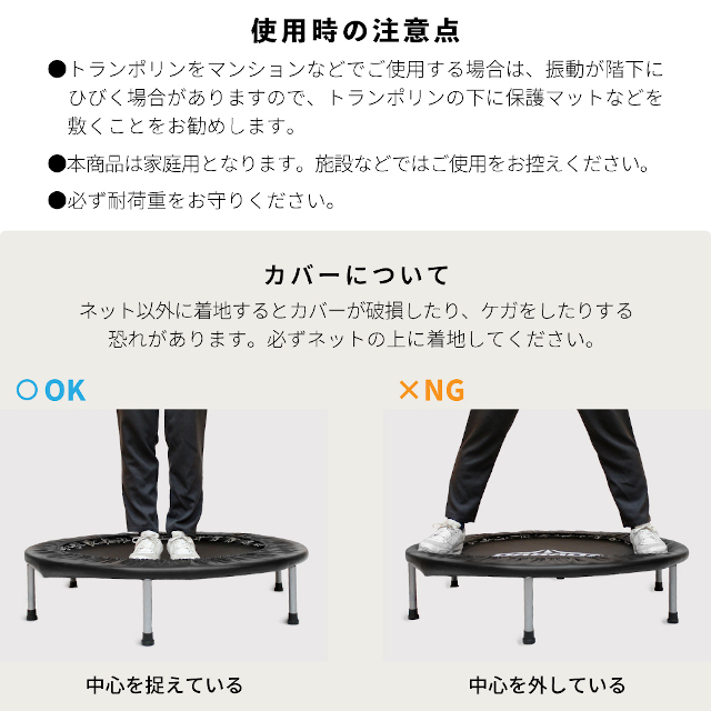 | 仕様 | -トランポリン- 本体サイズ(約):直径102×高さ22cm 本体重量(約):6.7kg 本体カラー: ピンク/レッド/オレンジ/イエロー/グリーン/ブルー/スカイブルー/シルバー/ブラック/パープル/ホワイト/グレージュ 付属品:脚6本/カバー/予備バネ3本 耐荷重:150kg 【 安全にお使いいただくための“重要ポイント”】 1.取扱説明書を読み、組み立て・折りたたみは大人2人以上で、ゆっくり行ってください(指はさみに注意)。 |