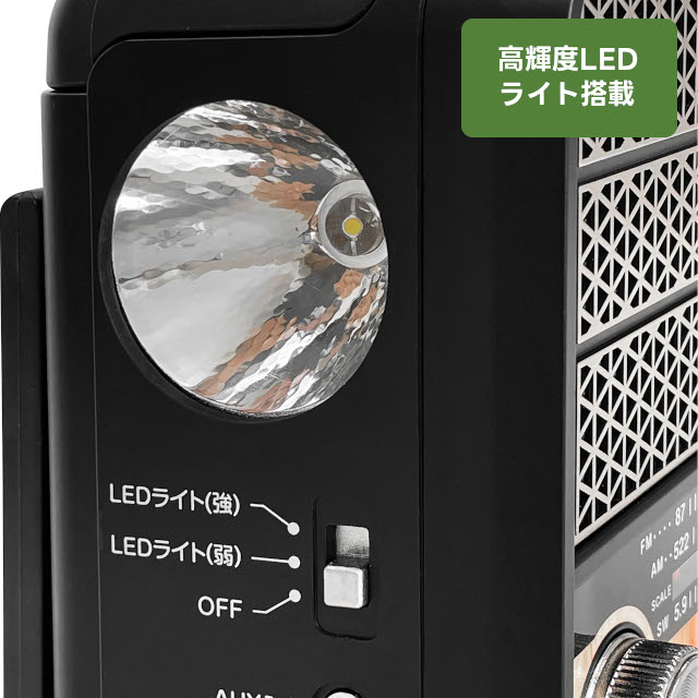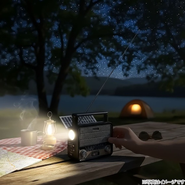 電源もコンセント・単一形乾電池×2本・USBケーブル・ソーラー充電(充電のみ)と幅広い給電・充電方法でどんな場所でも使えます。