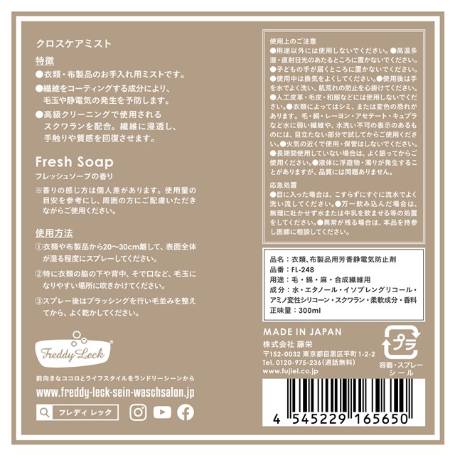 FREDDY LECK クロスケアミスト 300ml FL-248【フレディレック スクワラン ニット ウール ニットケア 衣類用 毛玉防止 静電気防止 フレッシュソープの香り カシミヤ コート ストール マフラー カーディガン コート 綿 麻 絹 合成繊維 母の日 クリスマス xmas 藤栄 FUJIEI】