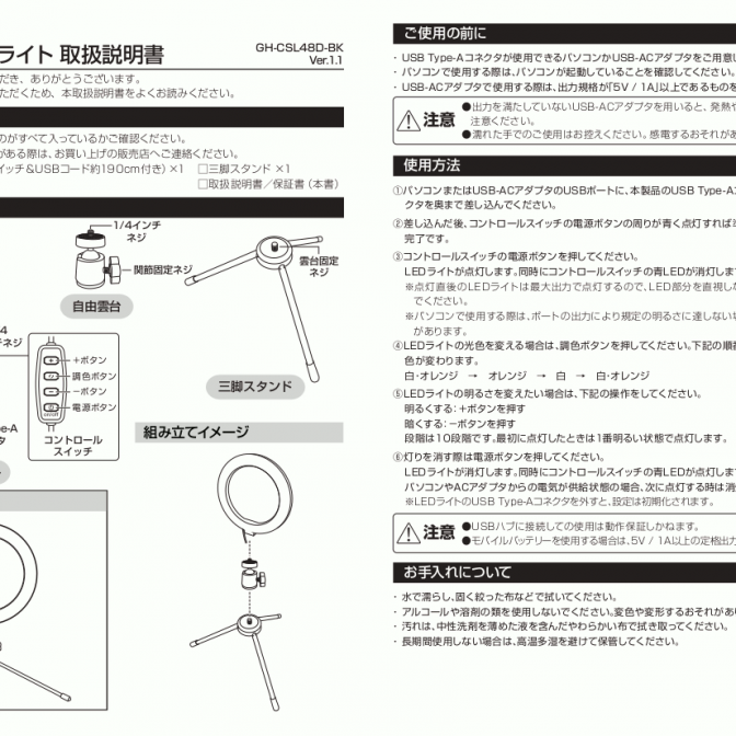 LEDリングライト(48灯) GH-CSL48D-BK【グリーンハウス】【キレイ 明るさ調整 タブレット PC 充電 美肌 美瞳 セルフィーライト リモートワーク テレワーク】