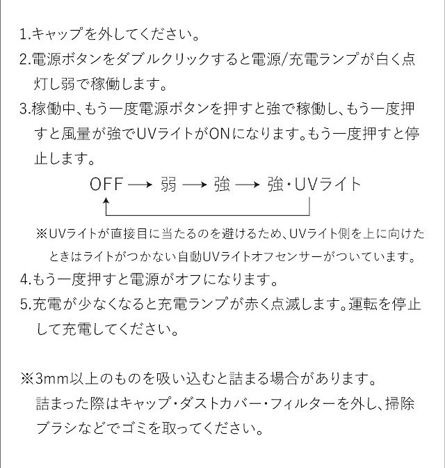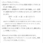 | 仕様 | 重量 191g 電源 DC5V 0.6A 消費電力 3W 充電電池 リチウムイオン電池3.7V 1200mAh 充電時間(約) 2.5時間 モード 3段階(弱/強/強+UVライト) 電源コード(約) USBコード:760mm(Type-C) 満充電時の合計使用可能時間 1.5時間(強モードのUVライト使用時)~2.5時間(弱) |