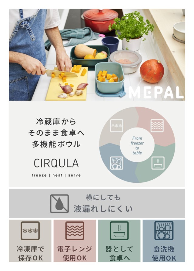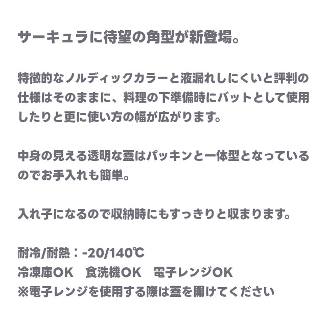| 注意事項 | 耐冷/耐熱:-20/140℃ 冷凍庫OK 食洗機OK 電子レンジOK ※電子レンジを使用する際は蓋を開けてください |
