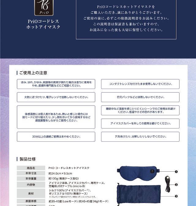 PriO コードレスホットアイマスク 131067 ネイビーブルー アイスブルー パウダーピンク ホットアイマスク【アイピロー 眼精疲労 睡眠 安眠 リラックス 充電式 目 アイマスク 絹 シルク 快眠 ナイトケアー 母の日 父の日 敬老の日 クリスマス xmas】
