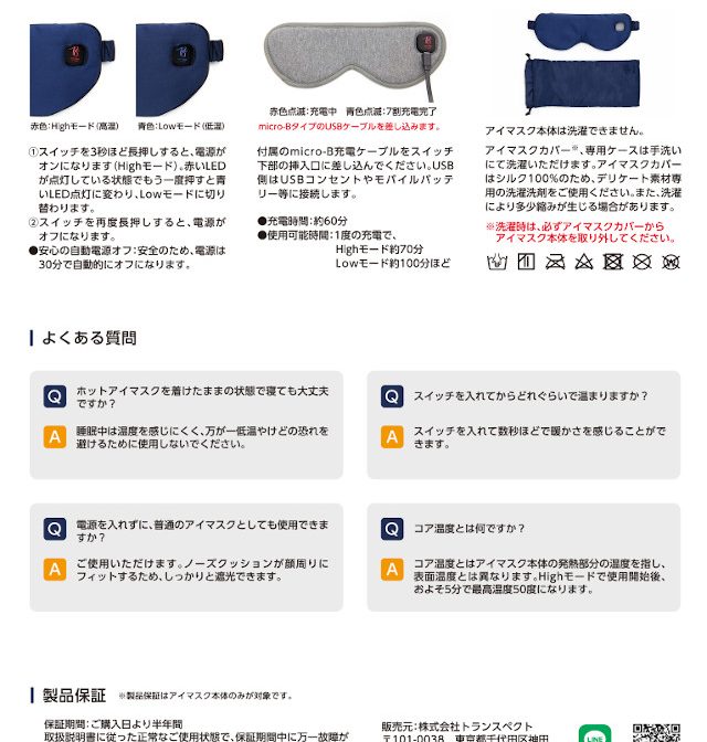 | 内容物 | アイマスク本体、アイマスクカバー、専用ケース、充電用USBケーブル(micro-B)、取扱説明書 |