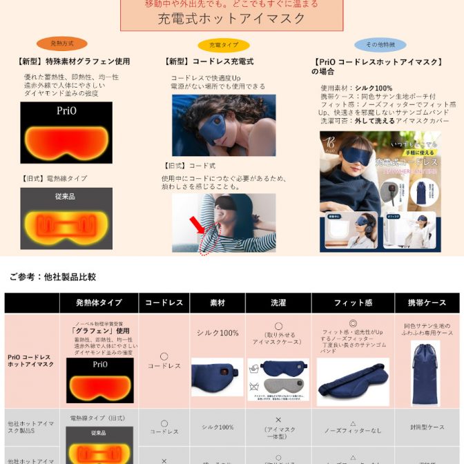 PriOコードレスホットアイマスクは、USB充電式・コードレスだから、「いつでも・どこでも」手軽に使える便利さが魅力!