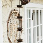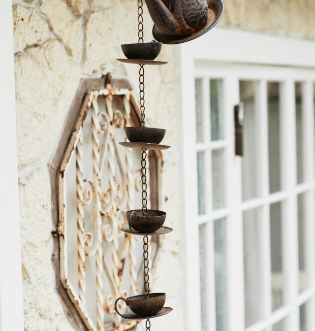 鎖樋は屋根から横樋に導かれた雨水が鎖を伝うように排出されるのを目で見て楽しむ、日本で発祥した建材です。