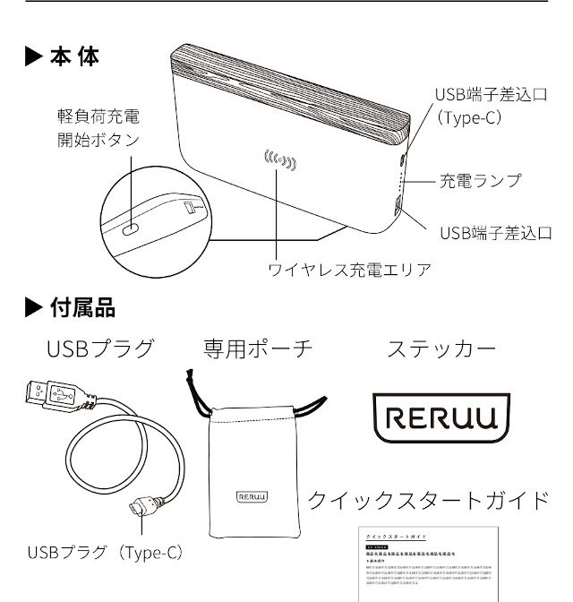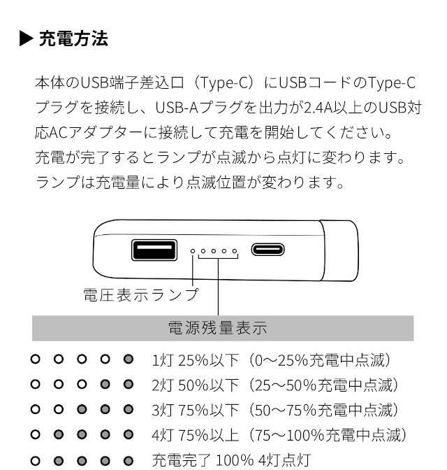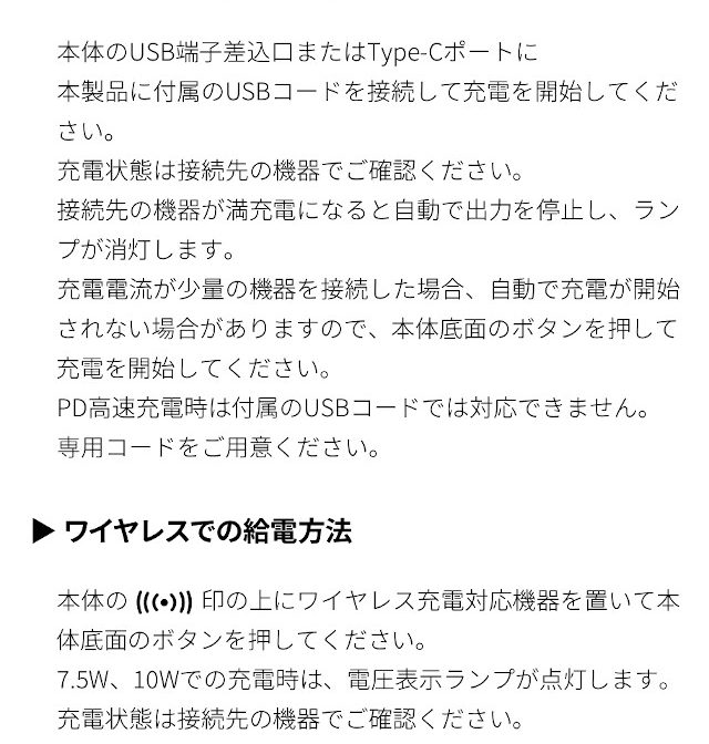 | 仕様 | 重量 250g 最大入力(USB Type-C) 18W 合計最大出力 DC5V 3A 最大出力(USB Type-C) DC5V 2.4A、DC9V 2.22A、DC12V 1.67A 最大出力(USB-A) DC5V 3A、DC9V 2A、DC12V 1.5A 最大出力(ワイヤレス充電) 5W、7.5W、10W 充電電池 リチウムイオンポリマー電池3.85V、10000mAh ポート数 Type-Cポート×1、USB-Aポート×1 電源コード(約) USBコード:450mm(Type-C) ワイヤレス充電対応 有 USB Power Delivery 準拠(Type-C) Quick Charge 準拠(USB-A) 充電時間(約) DC5V/3A供給時約4時間 12V/1.6A供給時約2.5時 |