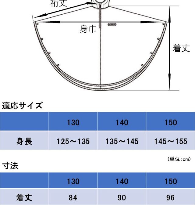 | サイズ | ■男女兼用 130サイズ: 着丈 84cm、身巾121cm、裄丈62.5cm、身長125cm〜135cm 140サイズ: 着丈 90cm、身巾124cm、裄丈64cm、身長135cm〜145cm 150サイズ: 着丈 96cm、身巾127cm、裄丈65.6cm、身長145cm〜155cm |