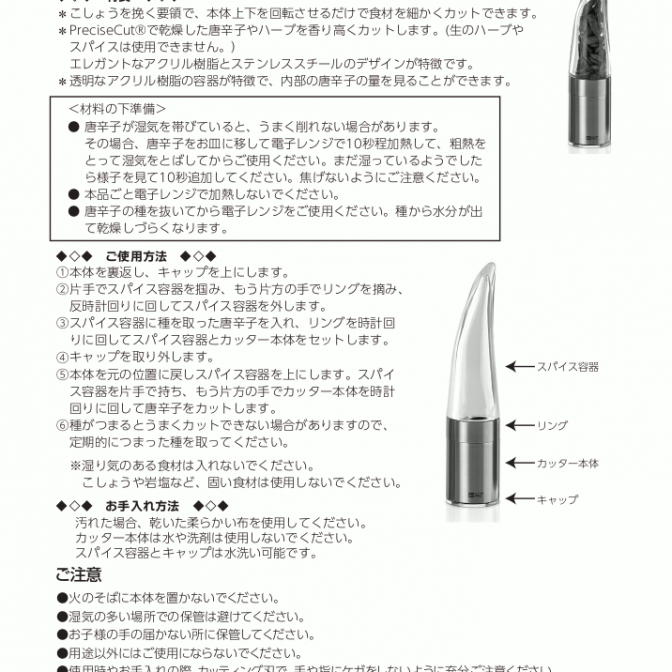 3:スパイス容器に唐辛子を入れ、リングを時計回りに回してスパイス容器とカッター本体をセットします。