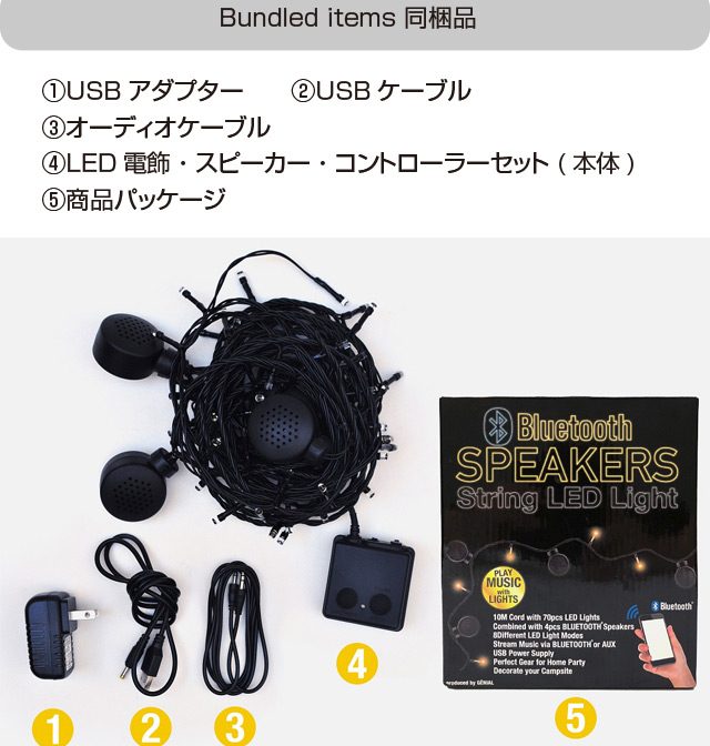 | 詳細 | Bluetooth内蔵スピーカーx4個、LED電球x70個 ブルートゥース規格:ver4.2+EDR |