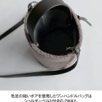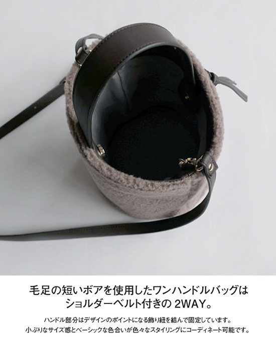 毛足の短いボアを使用したワンハンドルバッグはショルダーベルト付きの2WAY。 ハンドル部分はデザインのポイントになる飾り紐を結んで固定しています。 小ぶりなサイズ感とベーシックな色合いが色々なスタイリングにコーディネート可能です。